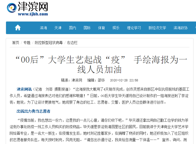 3月18日,天津电视台《都市报道60分》栏目报道了我校艺术学院学生毕天叆尽己所能,助力疫情防控的事迹。此前,2月24日,今日头条以“20岁大学生毕天叆助力疫情防控,捐赠防控物品,参与志愿服务”为题,报道了毕天叆助力疫情防控的事迹。大众新闻、新浪网、中国网等多家媒体转载。2月28日,津滨网以“‘00后’大学生艺起战‘疫’手绘海报为一线人员加油”为题对其事迹进行报道。